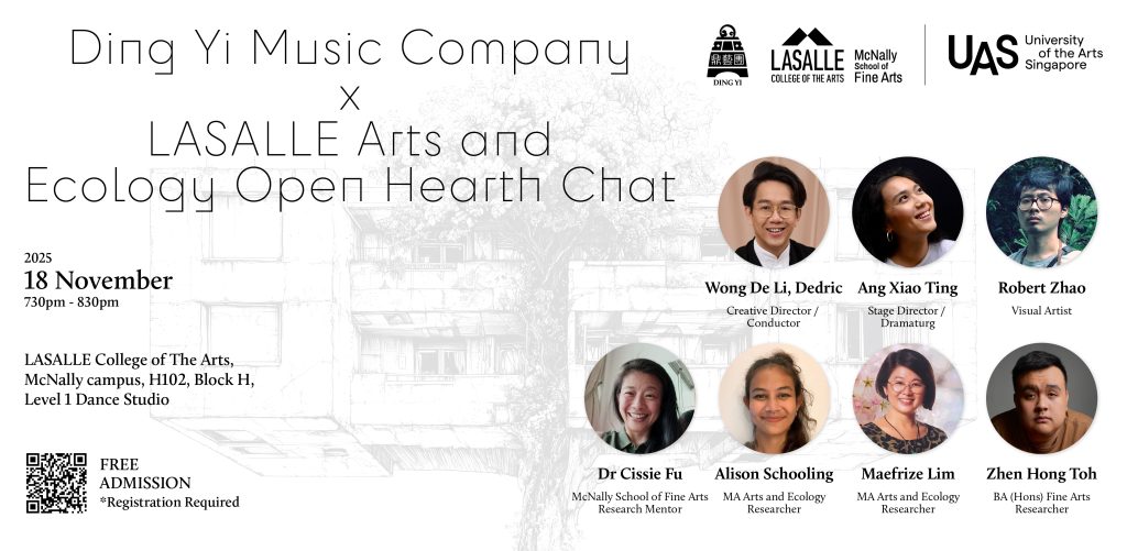 Swiftly following ECOncert 2025, this Open Hearth Chat brings together BA (Hons) Fine Arts and MA Arts and Ecology student researchers from LASALLE College of the Arts, mentored by LASALLE’s Head of McNally School of Fine Arts Dr Cissie Fu, and Ding Yi Music Company in a reflective dialogue on sustainability, performance, and ecological imagination.